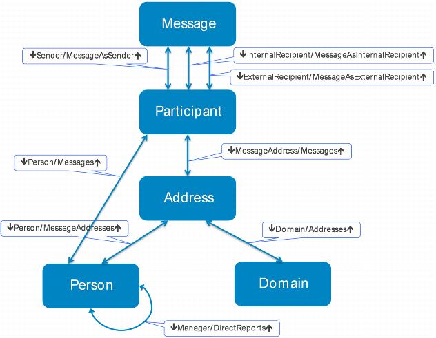 Message: Holds one object per sent email. Each object stores values such as Body, Subject, Size, and SendDate and links to Participant objects in three different roles: sender, internal recipient, and external recipient.